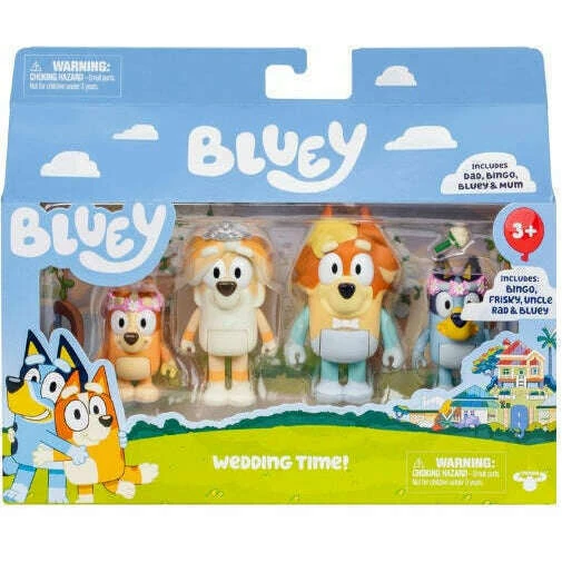 The “Wedding Time” 4 Pack includes Bluey & Bingo dressed as flower girls, Uncle Rad and Frisky