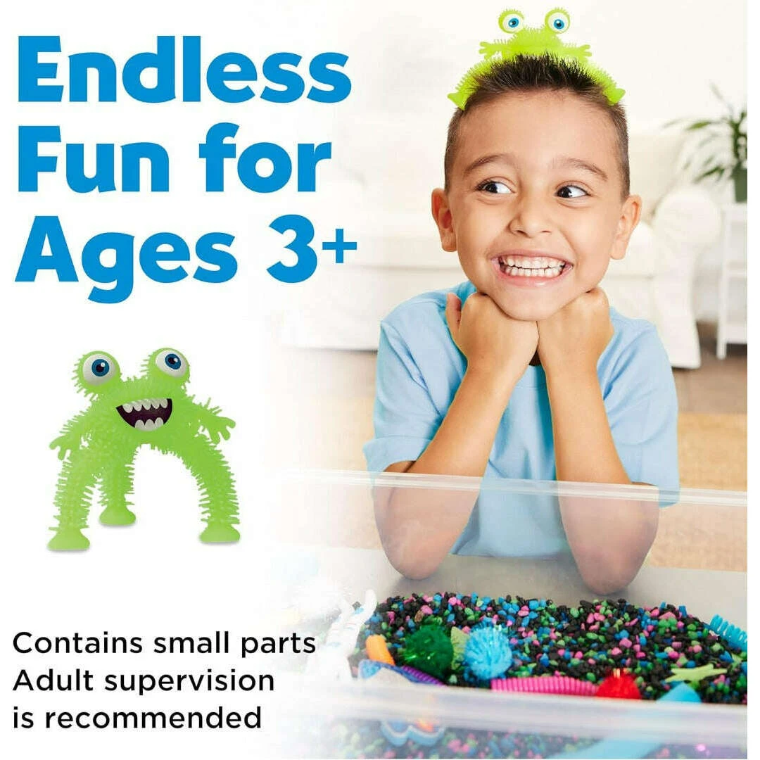 Sensory toys come conveniently packed in a bin with a lid for easy storage. Sensory bin measures approximately 10.25″ L x 14.5″ W x 4.75″ H. When your family is done playing and engaging with the sensory bin, upcycle it by storing small toys and keepsakes inside. You can also recycle the sensory bin after use.