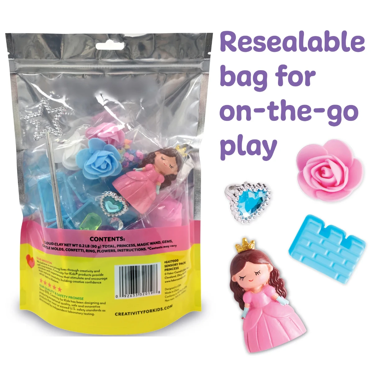 · Sensory Pack Princess provides a low-mess sensory activity perfect for toddlers and enjoyable for all. With super soft and stretchy cloud clay that never dries out, little hands stay clean and surfaces remain residue-free, ensuring easy cleanup and peace of mind.