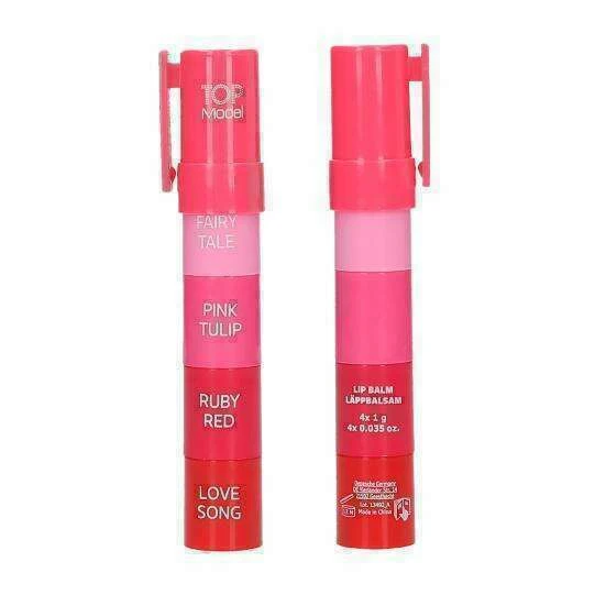 Why only one colour when you can have four? The TOPModel lip balm consists of 4 individual tinted lip balms from red to rosé, which are stacked on top of each other. With cute colour name prints and a great candyfloss scent. Contents: 4x 1g