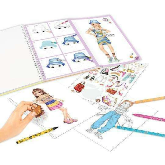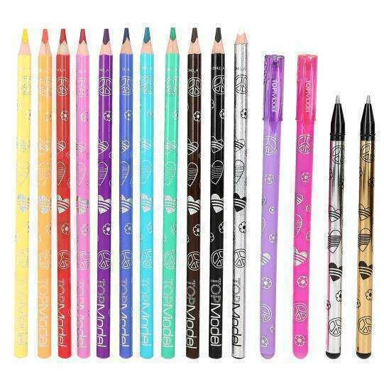 Ready for great looks: The TOPModel coloring book set in the new rainbow-colored look includes 76 coloring pages (some pre-printed in color), 2 fold-out pages with colorful coloring templates, 2 sticker sheets, and the pens essential for the design (10 colored pencils, 4 gel pens (gold, silver, pink, purple), 1 eraser).