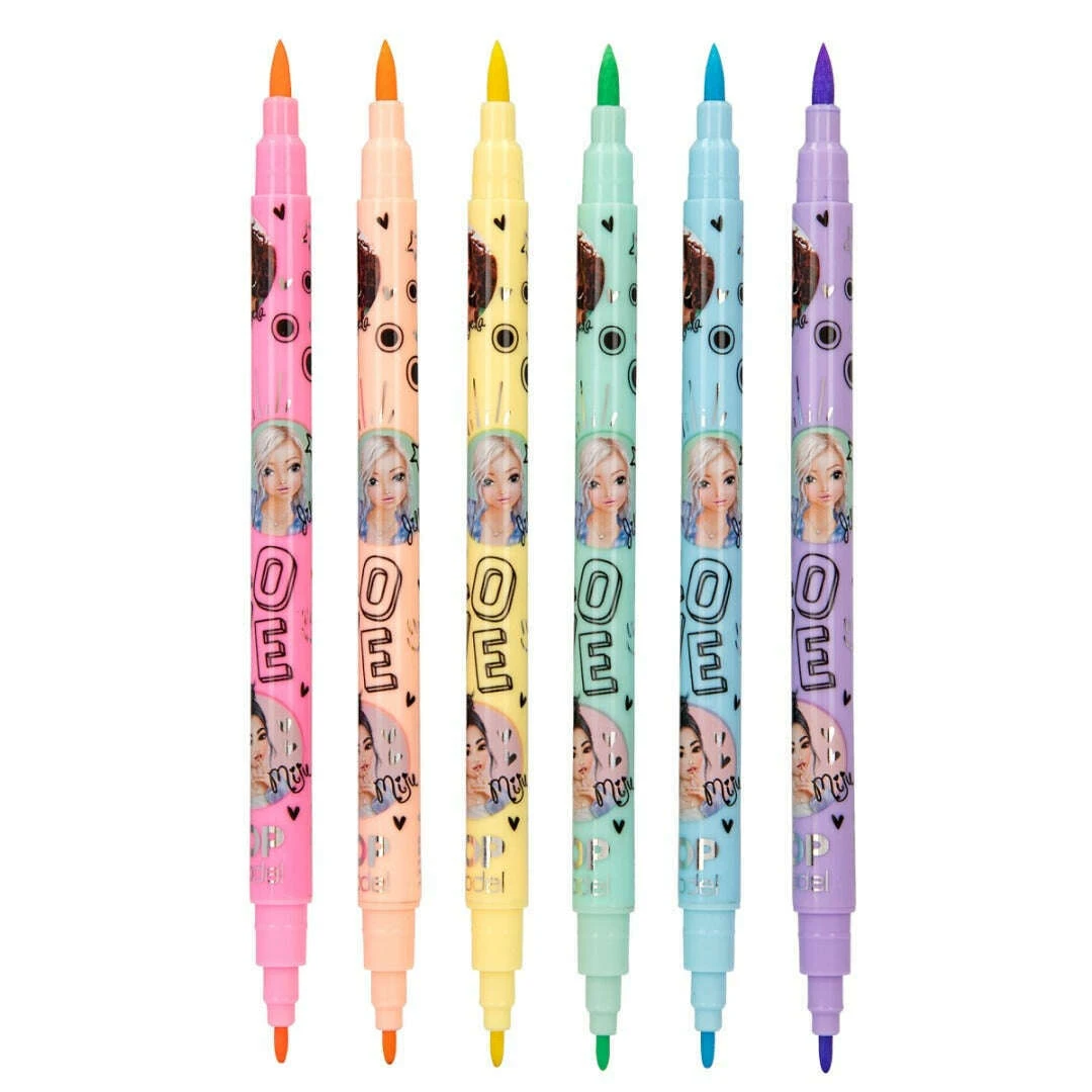 Pastel is trend! The 6 double fibre-tip pens each have a brush tip and a fine felt pen tip (1 mm). In soft orange, yellow, green, blue, purple and pink.