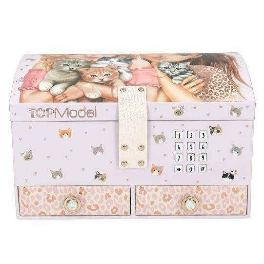 For little treasures and secrets: The cute little jewellery box from TOPModel only opens when the correct code is entered (can be personalised and changed). Then the top hit Shivers plays for approx. 20 seconds. Inside, the jewellery box has a removable inlay with three compartments and a mirror. On the outside are two further drawers with a jewellery stone button. The rose-coloured jewellery box has a large double model motif with a kitten on the hinged lid and lots of cute cat faces, leo prints, paw prints and hearts all around and inside. Batteries included and replaceable.