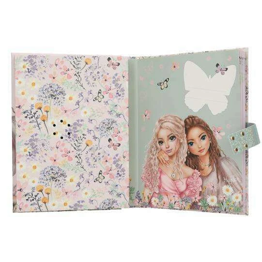 For thoughts and secrets: The TOPModel diary only opens when the correct four-digit code (personalisable and changeable) is entered. Then the top hit Anti-Hero by Taylor Swift plays (approx. 20 seconds). The outside of the diary has a great double model motif and a print of lots of flowers and butterflies in soft colours. Inside, 80 finely lined and colourfully illustrated pages are waiting to be written on.