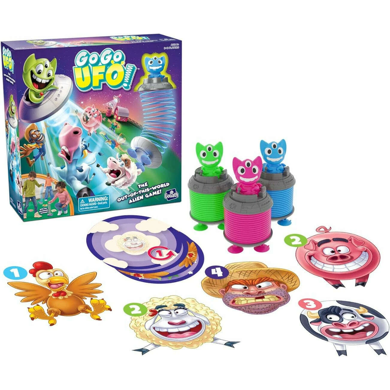 Get ready to blast into space with this crazy alien adventure game! Use the bouncy UFOs to abduct farm animals to bring back to your home planet, but keep an eye out for the Alien Antics Cards. Grab the farm animals and make some cosmic combinations to get the most points to win! Kids love the non-stop slinky action as they race to capture the most cards! Includes 3 UFOs, 16 Farm Cards (4 Chickens, 4 Sheep, 3 Cows, 3 Pigs, 2 Farmers), 4 Alien Antics Cards, and Complete Instructions. Recommended for 2-6 players, ages 6 and up.