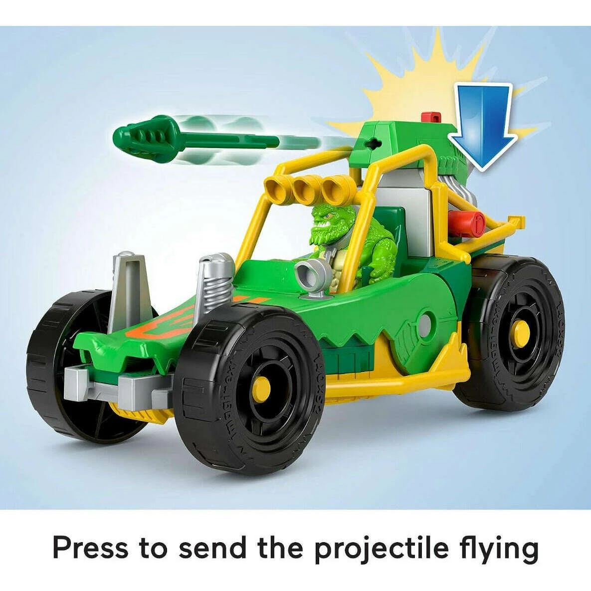 Preschool kids can race into mischievous Gotham City adventures with this Imaginext DC Super Friends figure and toy car set featuring Super-Villain Killer Croc. Kids can place the figure in the push-along buggy to get the action started. Then, with the press of the Power Pad, the vehicle’s hood pops up for awesome chomping action! For added pretend play, kids can load, press and launch the projectile from the rear launcher.