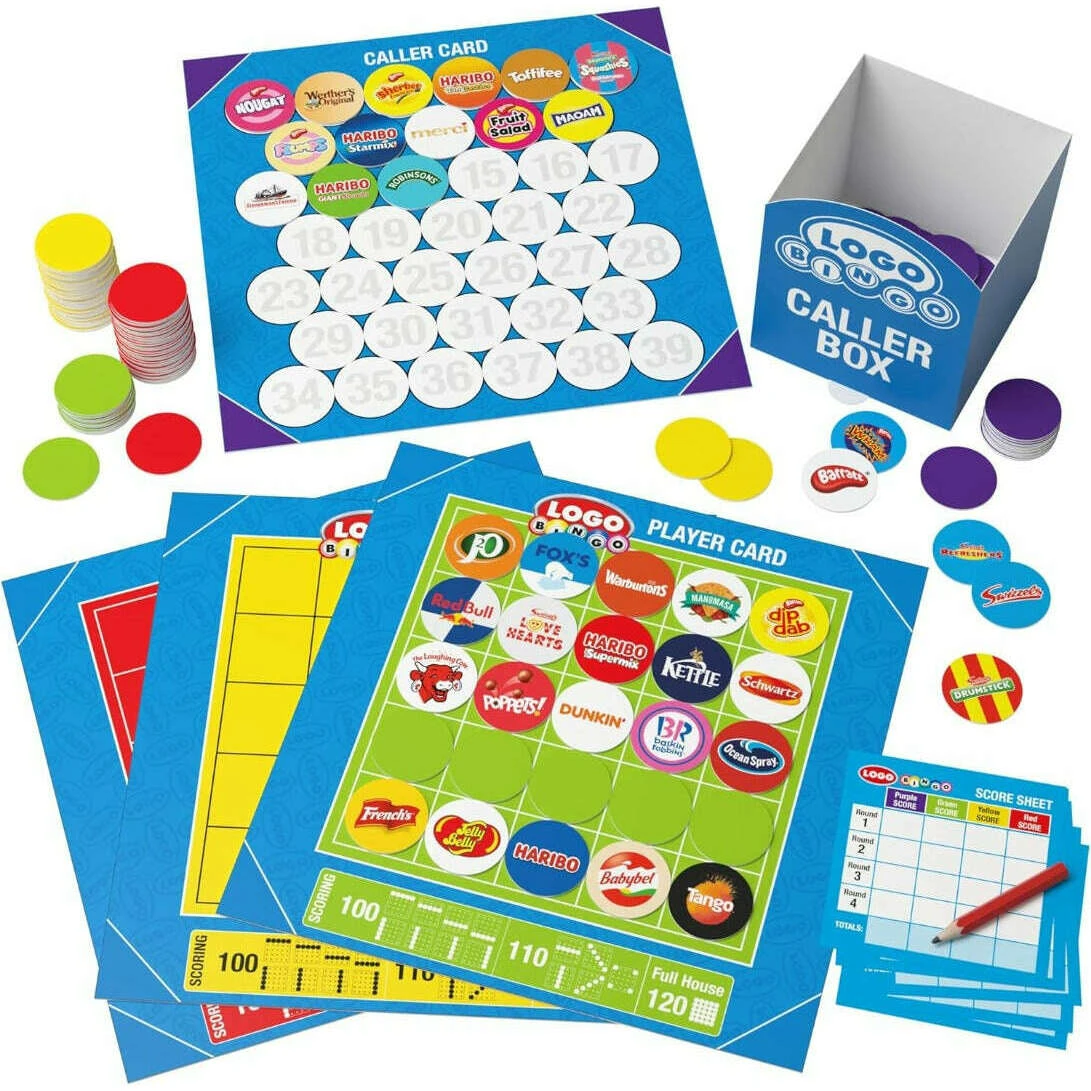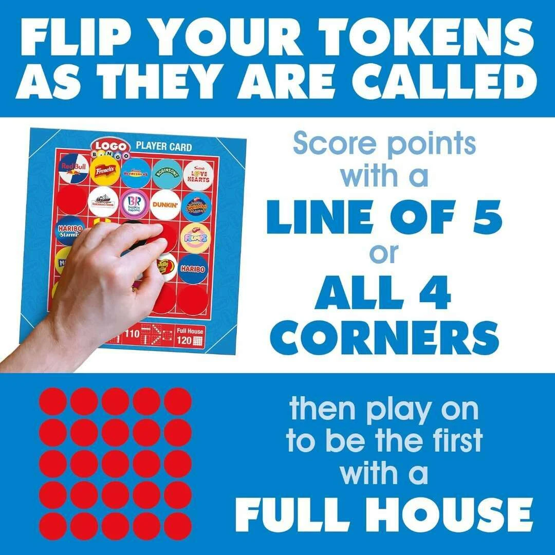 First with a line of 5 or all 4 corners gets a bingo victory, but you can keep the family game going by playing on to see who is the first to get a Full House. Change bingo caller between rounds then total up scores to see who the Logo Bingo champion is!