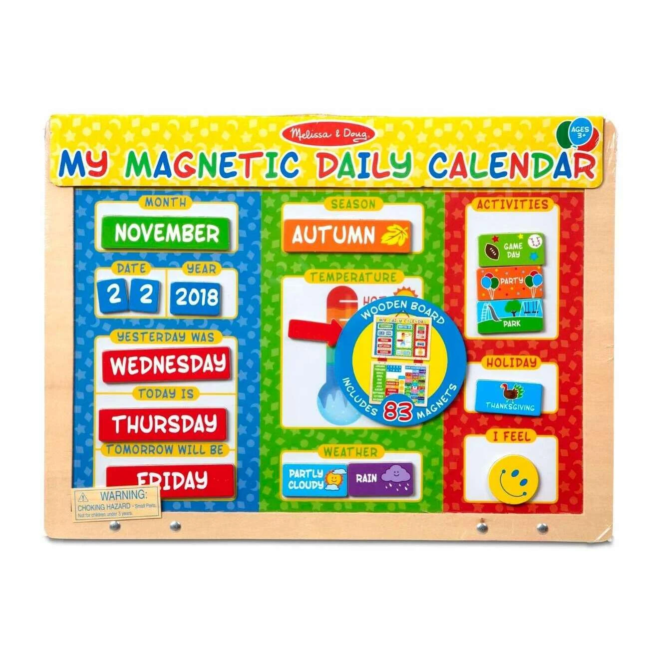 What is today? For a child, that simple question can have so many answers–and this daily calendar helps satisfy them all! Kids will feel a greater sense of control and responsibility when they help post the day of the week, date, weather, and special events on the large magnetic board for all to see. There’s even a space to post their mood–an excellent way to open communication and encourage children to gauge their own emotions. Updating the information is simple: Simply take a preprinted magnet from the lower magnetic board (which hangs below the calendar to keep magnets within easy reach). Then place it on the calendar to fill in the information . . . or make a custom magnet by writing on one of two dry-erase magnet tiles! There are fields for day, date, season, weather, temperature, activities, holiday, and mood.