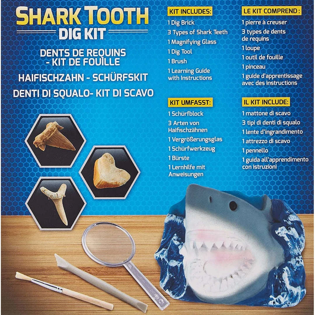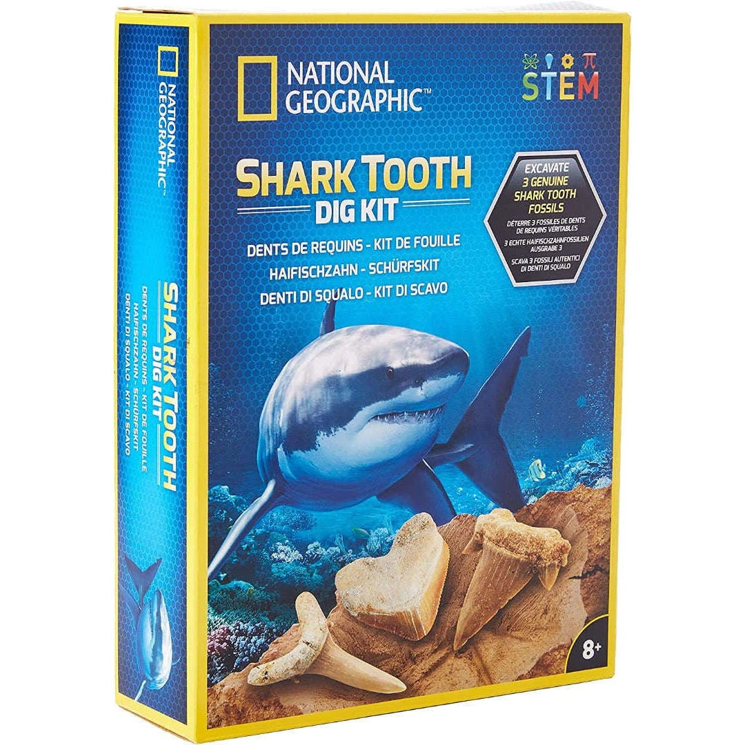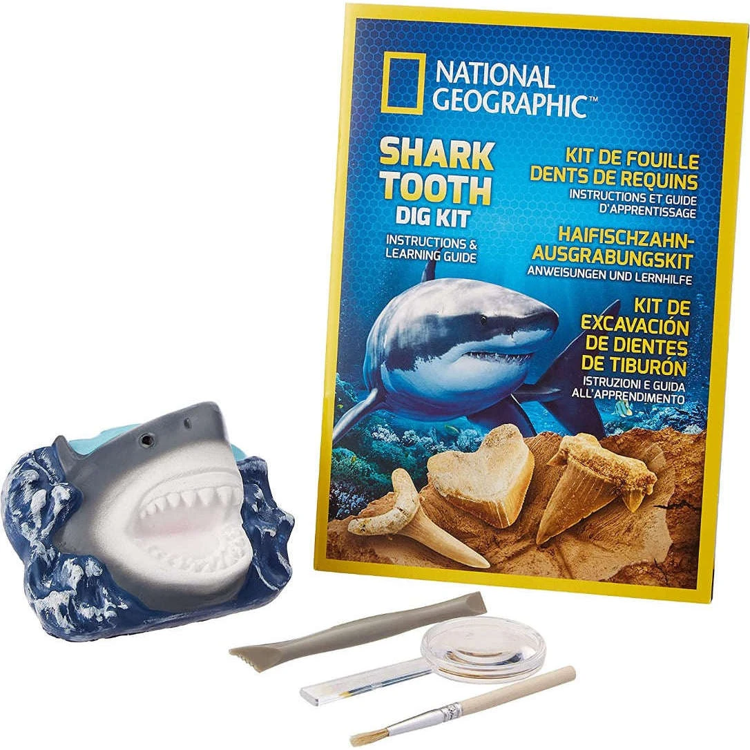 Excavate 3 Genuine Shark Teeth Fossils from the Ocean’s Deadliest Predators! National Geographic’s Shark Tooth Dig Kit lets children dig up and explore fossils from three different species of shark. With a full-colour learning guide full of amazing shark facts and pictures, kids will have a blast while they identify the teeth of the sand tiger, otodus, and crow sharks, and learn all about what make sharks the ocean’s most feared predators. This science kit includes: A shark-themed digging brick with 3 fossilized shark teeth (each from different species of shark), archeological digging tools, full-colour learning guide, and magnifying glass. This dig kit makes a great gift for any child ages 6-15 years with an interest in sharks, fossils, or science. With 3 amazing fossils to uncover, children can start an impressive fossil collection that they can show their friends. This kit is a favorite among both boys and girls. So get your Shark Tooth Dig Kit today and learn all about the underwater world of the shark!