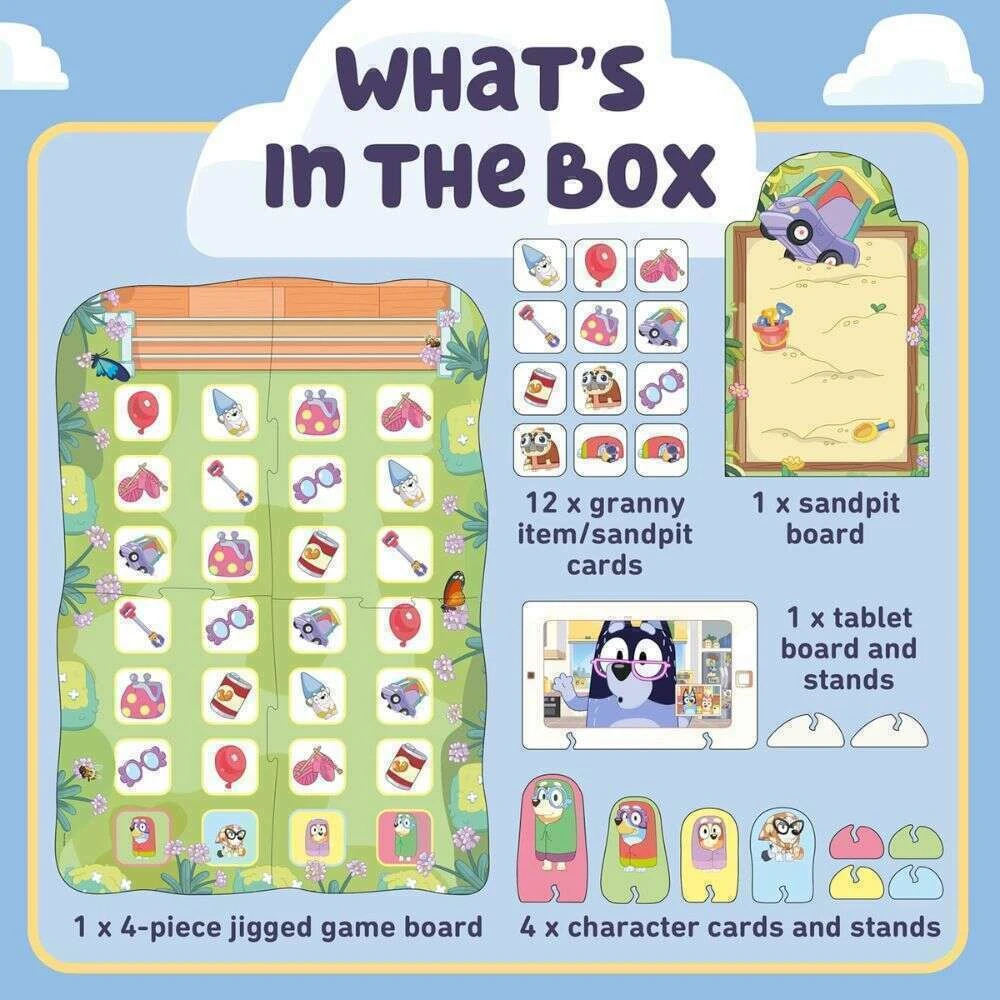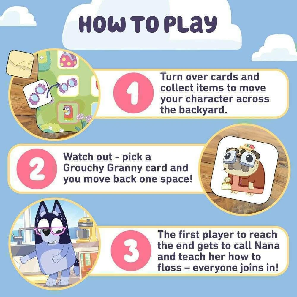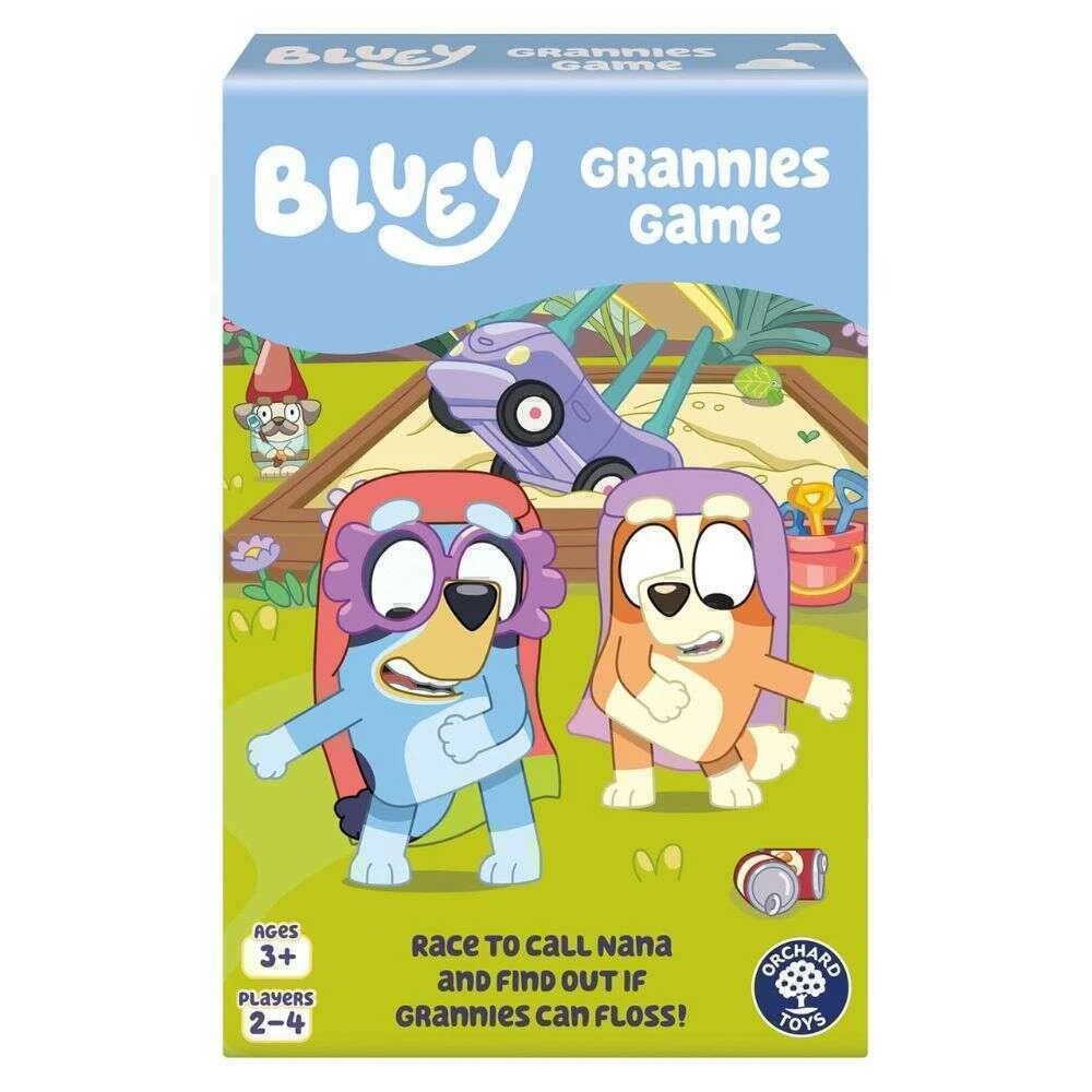 Join Bluey and her hilarious granny friends — Janet (Bluey), Rita (Bingo), Gladys (Muffin), and Madge (Chilli) — for a fun-filled adventure! Perfect for children aged 3+, this exciting board game is packed with laughter and action as players race to collect items on their garden path. The first to finish gets to call Nana and start a flossing party!