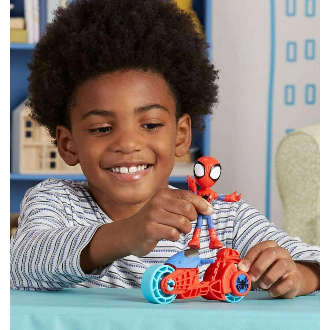 This 10-cm Spidey action figure can zoom to the rescue on the free-rolling toy motorcycle