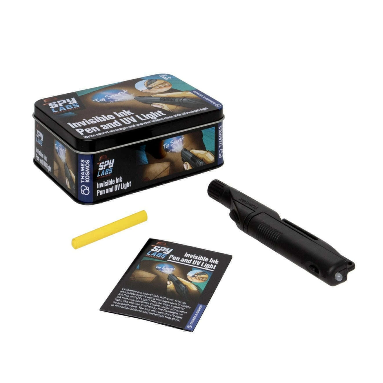 Exchange top secret info with your friends and fellow agents using this high-tech device. The pen uses a special ink that only becomes visible under ultraviolet light, like the one emitted by the flashlight on its opposite end. You can also use the UV light to find other objects and materials that glow.