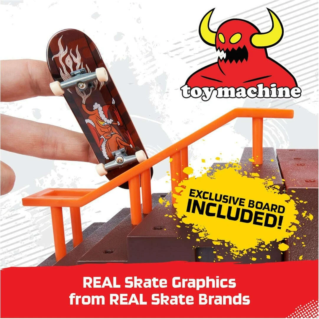 This includes everything you need to build an awesome custom park. Set up different combinations with the small pyramid, wedge ramp and rail to learn and progress your tricks. Drop from the pyramid, stall on the ramp, grind the rail or set up and customise the spot in any way you like. Skate the park with the included exclusive Toy Machine Skateboards pro fingerboard and add to your mini skateboard collection. Combine the park with other X-Connect compatible ramps to build the ultimate fingerboard obstacles for you to shred like Competition Wall 2.0 and Quarter Bowl Ruckus. Use this playset X-Connect Park Creator with your Tech Deck fingerboard collection or Tech Deck BMX (each sold separately). There are a tonne of decks, toy figures and playsets to collect (sold separately).
