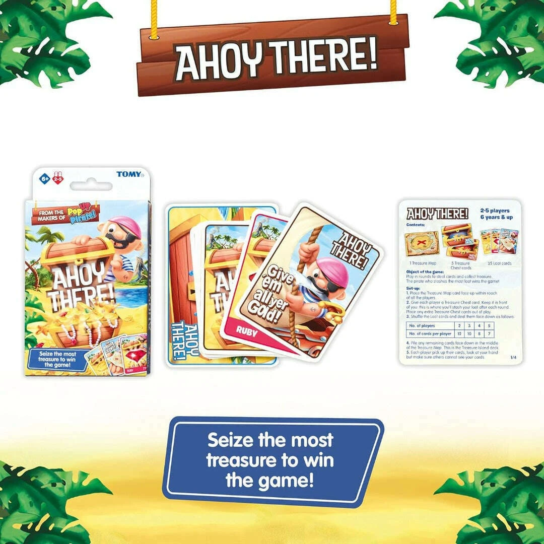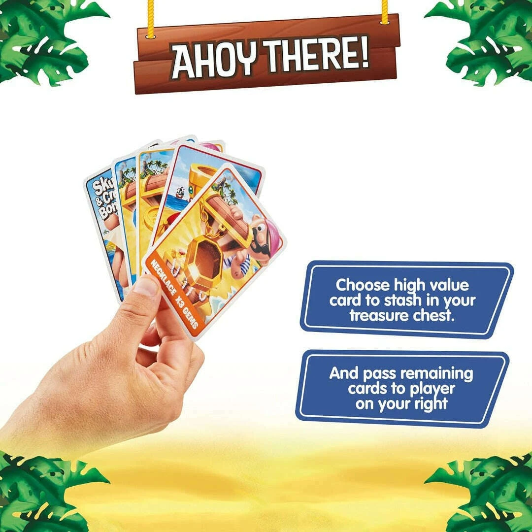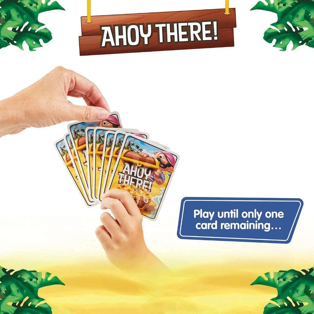 Play Ahoy There!, the fun card game that turns every player into a pirate! Steal cards from your neighbours, keep the best ones for your hoard of booty, then pass your hand overboard to the next player to see who’ll sink or swim. Dig for gems and a Holy Grail, look out for curses or losing all your loot. Stash the most treasure to win! 2-5 players, 6 years and up. Ahoy There! can take you high into the crow’s nest or see you sink deep down into Davy Jones’ locker! Pirates play round by round in a nerve-jangling battle of wits and tricks. Each buccaneer sets sail with a hand of Loot cards. When the captain shouts “Ahoy There!” it’s all hands on deck. Pick a card from the pirate to your left and add it to your hand. The next sailor to their left does the same and so on until everyone has chosen a card at random. Now use strategy and skill to decide which card to stash in your Treasure Chest the pile of booty in front of you and which cards to keep. Some are worth more than others, some spell trouble, some will be worth keeping in circulation. Next, everyone passes their hand to the player on their right! Time for the next round, this time with a brand new set of cards and choices! Keep playing until each pirate is down to one card. Look out for “Give ‘Em All Yer Gold”, a card that forces you to sacrifice your spoils. “Curses” mean trouble too, with points deducted at the end. “Skull & Crossbones” means you need to return a card to the deck. Then there are “Necklace” and “Gem” cards collect a set and you’ll boost your booty. Land the “Holy Grail” card and you’ll discover it’s worth much more than a few doubloons Tot up your points at the end and see which pirate has heaped the biggest haul to win!