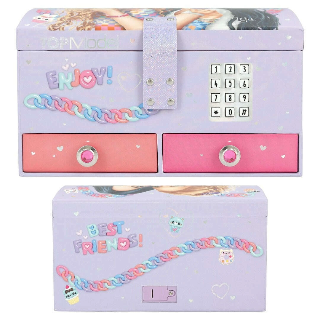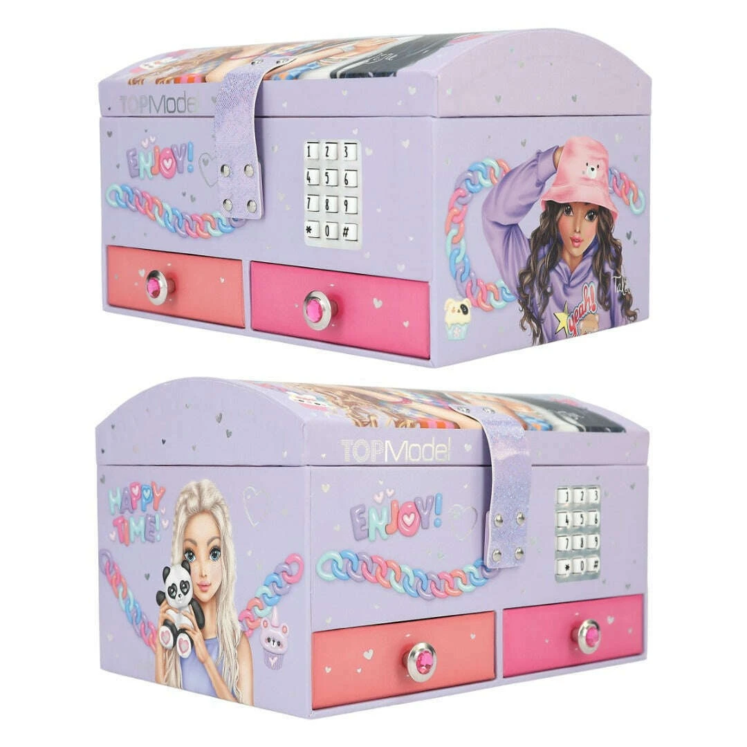 For small treasures and secrets: The TOPModel jewellery box only opens when the correct four-digit code (personally adjustable and changeable) is entered. Then the top hit Shivers sounds for approx. 20 seconds. The outside is a pretty, pale purple colour with great prints of trendy chain and pendant designs and a stylish double model motif on the lid. Inside, the jewellery box has a mirror, a removable inlay with three compartments and two drawers with jewellery stones on the handle knob.