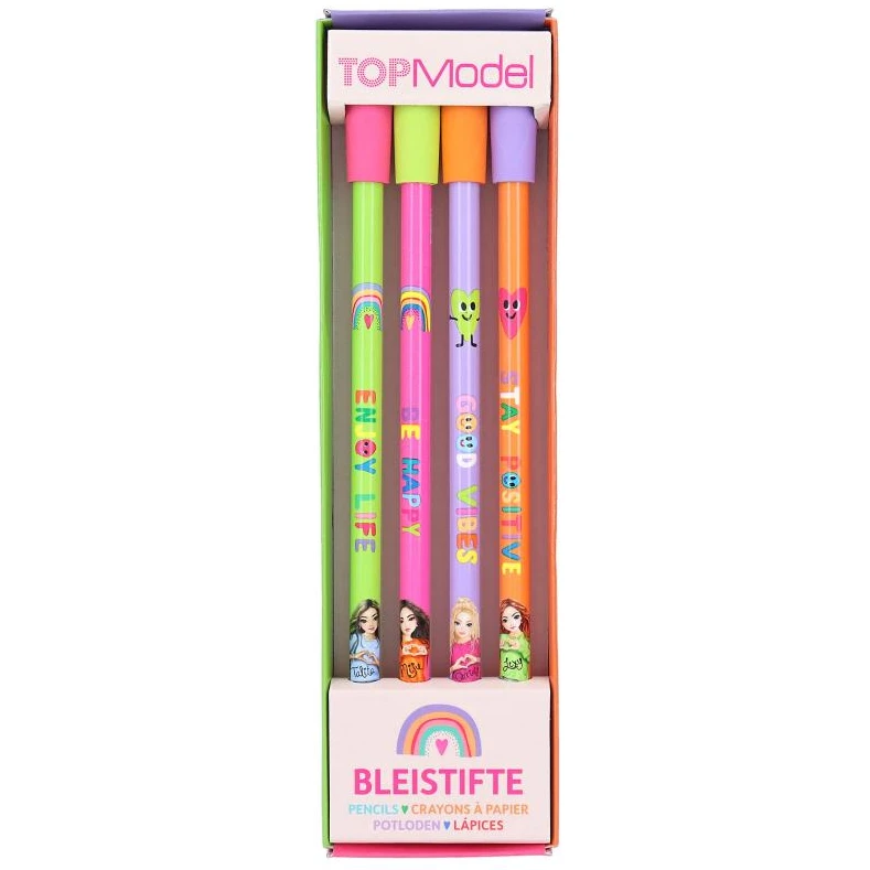 Colourful writing: The four pencils (HB) from the TOPModel series Selflove are not only visually cheerful. The texts also put you in a good mood: Stay Positive, Good Vibes, Be Happy, Enjoy Life. With matching colour eraser toppers to replace. Packed in a colourful cardboard box.