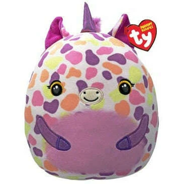 Astra is a white Squishy Beanies unicorn covered in purple, pink, orange and yellow patches. She has golden eyes with eyelashes, pink inner ears and a shiny purple horn. She also has a furry purple mane, a pink belly and purple legs.