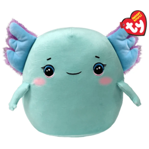 Charlie is a pale turquoise Squishy Beanies axolotl with sparkly blue eyes and rosy pink cheeks. She has fuzzy pink and blue gills and tiny arms.