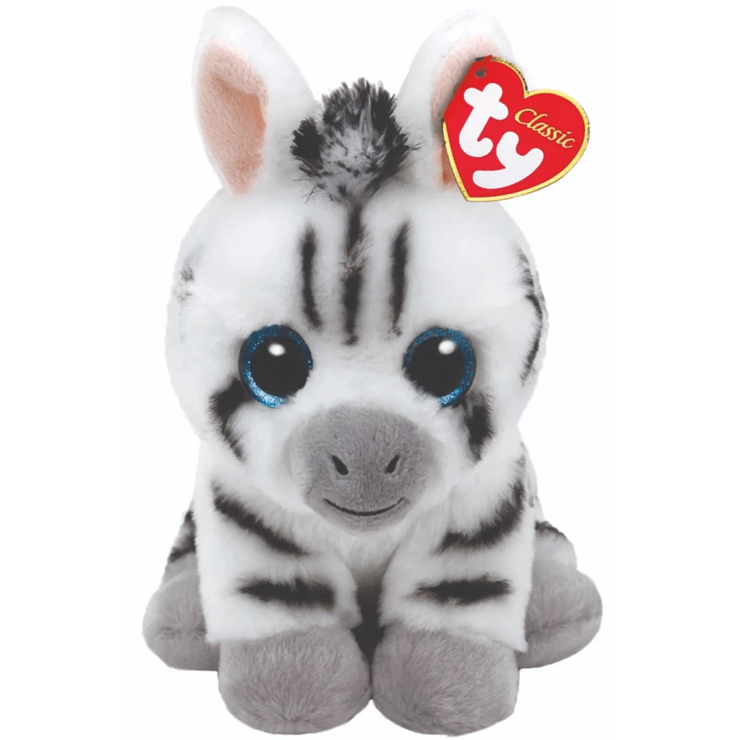 Stripes is a soft, white zebra with airbrushed black stripes covering him. He has glittery blue button eyes and a light grey muzzle with black stitching for his nostrils and mouth. He has light grey hooves and a fuzzy black and white striped mane and tail.