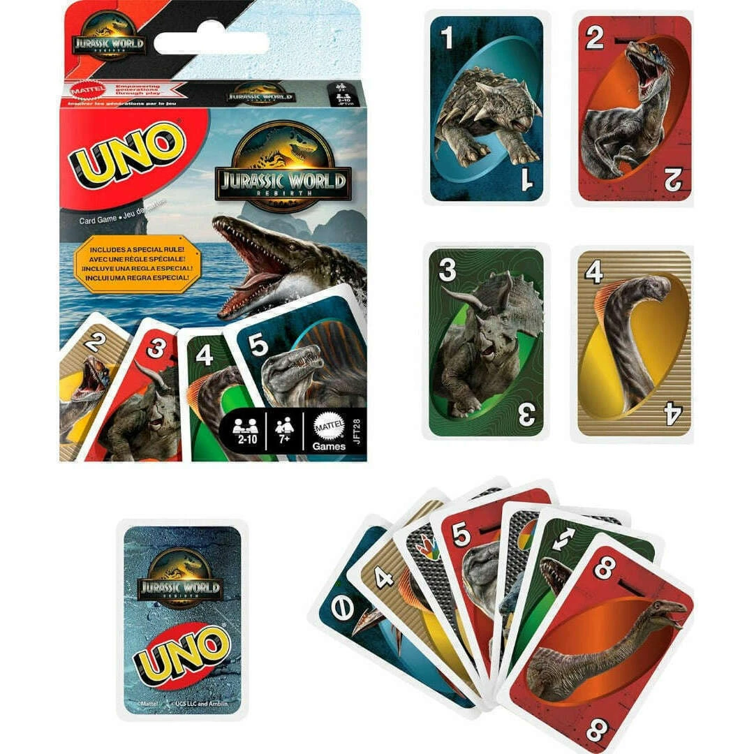 The UNO game players love features graphics inspired by characters from Jurassic World Rebirth.