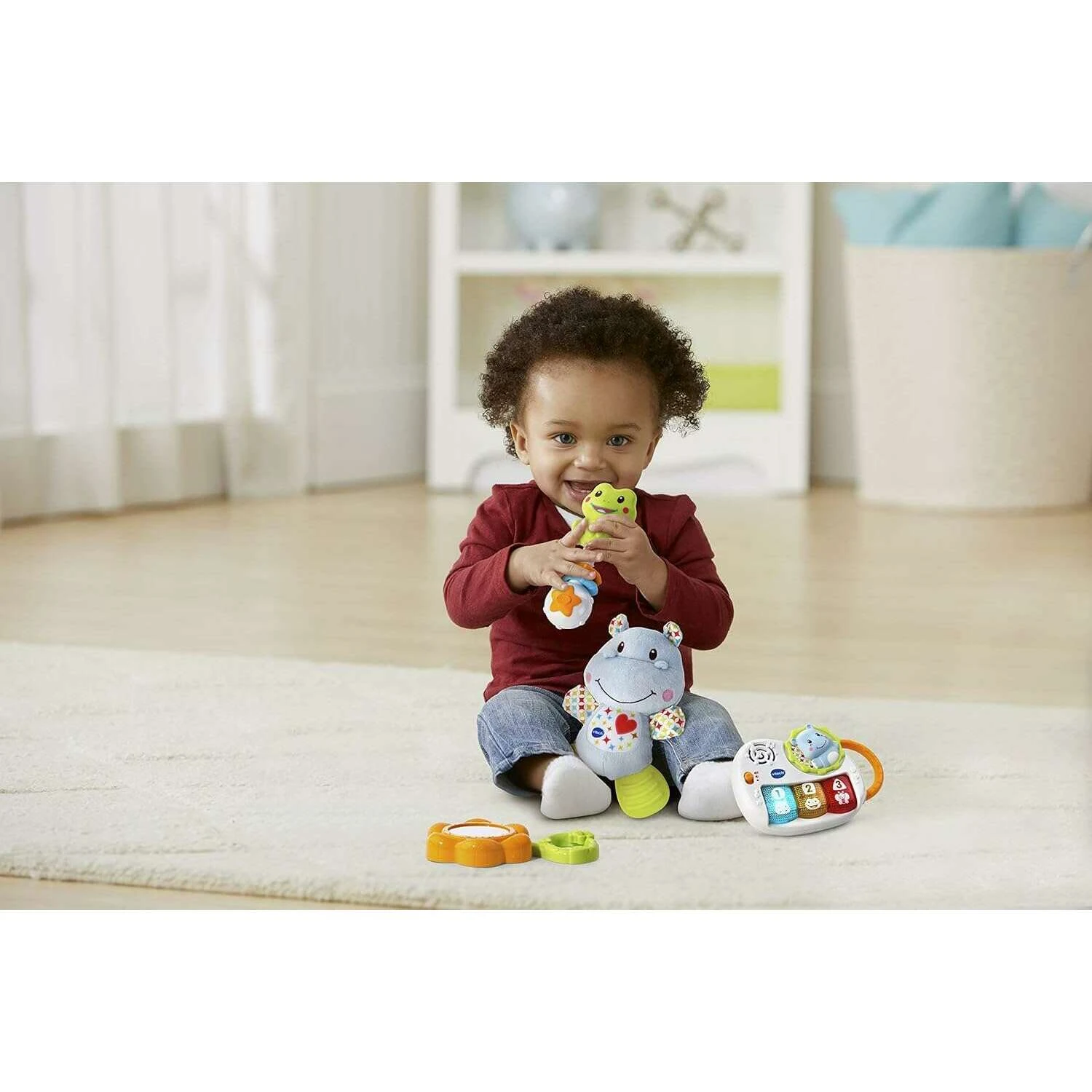 My 1st Gift Set by VTech is an ideal gift for little bundles of joy. Soft hippo teether, rattle and piano make the perfect on-the-go gift set for babies. The hippo teether is soft and comforting, a perfect little friend for baby during teething. The crinkle paper arms and soft fabric body provide tactile stimulation. The rattle has an easy to grip handle with two fun rattle play pieces that will move around when the rattle is shaken. The musical piano has 3 light up music buttons that introduce animals, numbers and colours. Includes 15 popular melodies, 4 sing-along songs and fun sound effects.